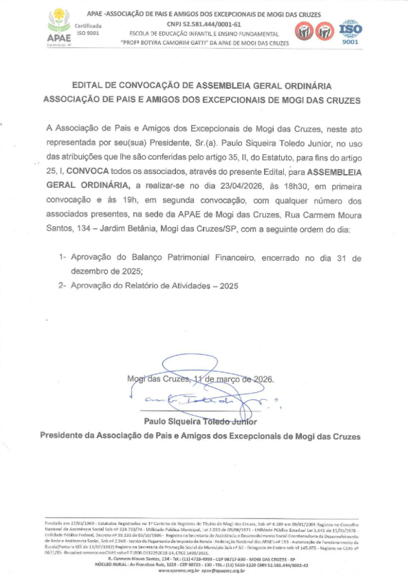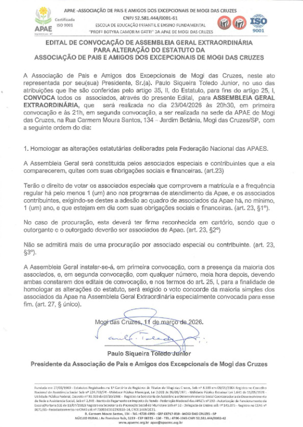 Apae de Mogi das Cruzes divulga editais de convocação de Assembleias Ordinária e Extraordinária Apae de Mogi das Cruzes divulga editais de convocação de Assembleias Ordinária e Extraordinária Assembleia Geral Ordinária Assembleia Geral Extraordinária