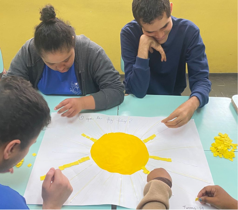 A festividade contemplou todas as idades. Na turma do socioeducacional, a professora Priscila Souza trabalhou o tema “Emoções Positivas”, promovendo uma contação de histórias sobre alegria, amizade e respeito. Após a leitura, os alunos realizaram uma pintura coletiva de um sol, em que cada um representou o que o faz feliz. A proposta buscou estimular o autoconhecimento e a expressão emocional de forma criativa e participativa.