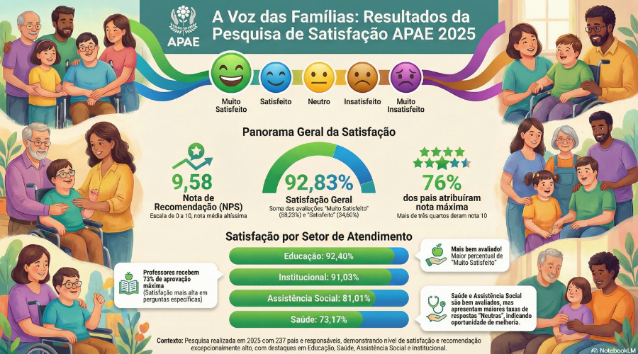 A APAE de Mogi das Cruzes alcançou 92,83% o de satisfação geral na Pesquisa de Satisfação 2025, realizada com 237 pais e responsáveis. O estudo também apontou nota média de recomendação (NPS) de 9,58 e mostrou que 76% das famílias atribuíram nota máxima à instituição, evidenciando elevado índice de confiança, acolhimento e qualidade no atendimento.…